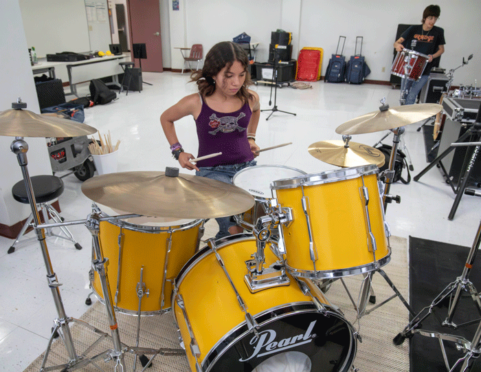 Catalina Rosa Morelos sits on a drum set for the first time during the first day of the You Rock summer camp being held at the EPCC Rio Grande campus.