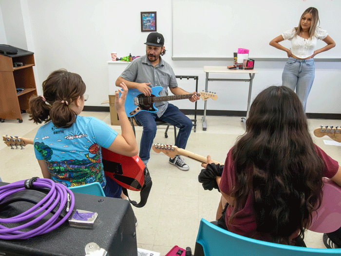 You Rock camp director Mike Hernandez explains how to hold the electric guitar to campers Monday at EPCC’s Rio Grande campus.