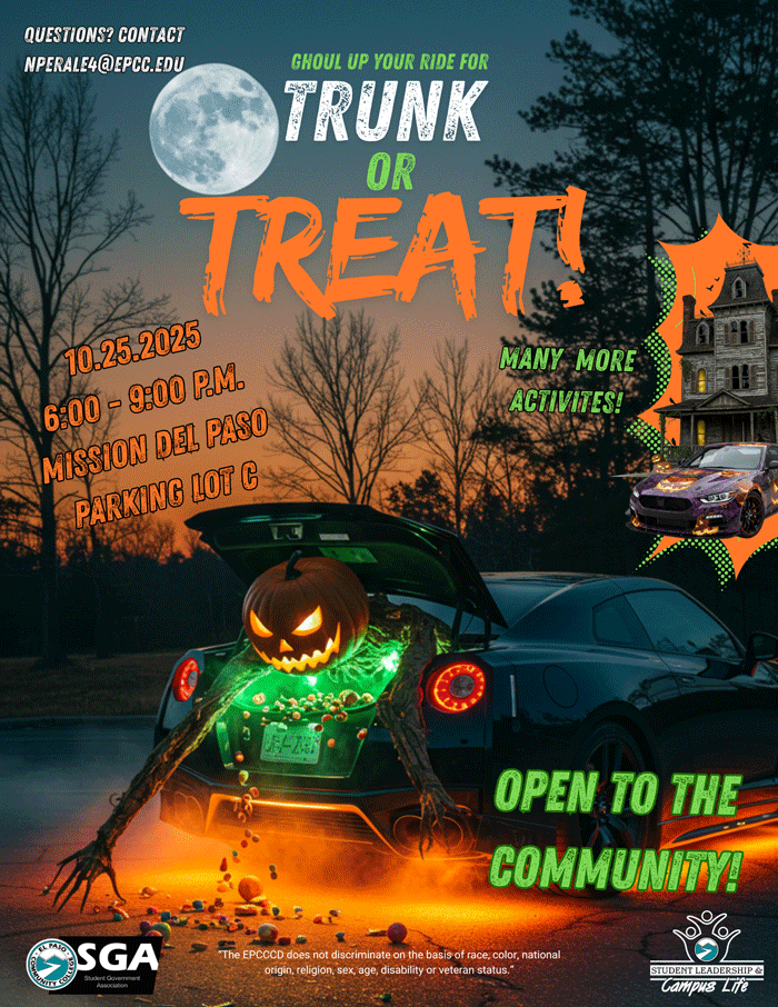 Oct. 25 Trunk or Treat! Mission del Paso Campus, 10700 Gateway Blvd East, El Paso, TX 79927, Parking Lot C, 6-9:00 p.m. (FREE, Open to Community!)