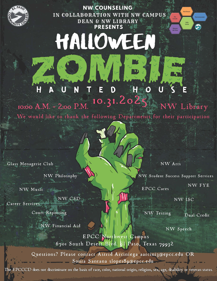 Oct. 31 Halloween Zombie Haunted House, Northwest Campus, 6701 S. Desert Blvd, El Paso, TX 79932, NW Library, 10:00 a.m. – 2:00 p.m. (FREE, Open to Community!)