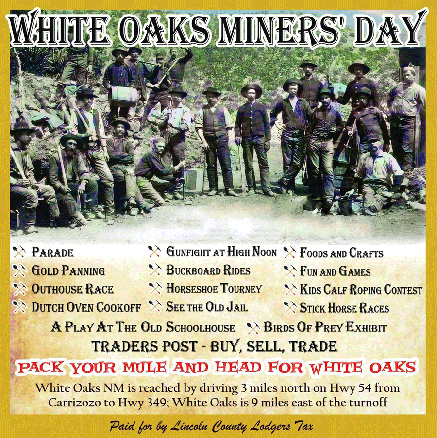 The town of White Oaks celebrates its Wild West past with a parade at 10 AM, a play at the schoolhouse, gold panning, a chuckwagon demonstration, food, and vendors. Music from noon to 4:00 pm at the No Scum Allowed Saloon, then again from 6:00- 11:00 pm.